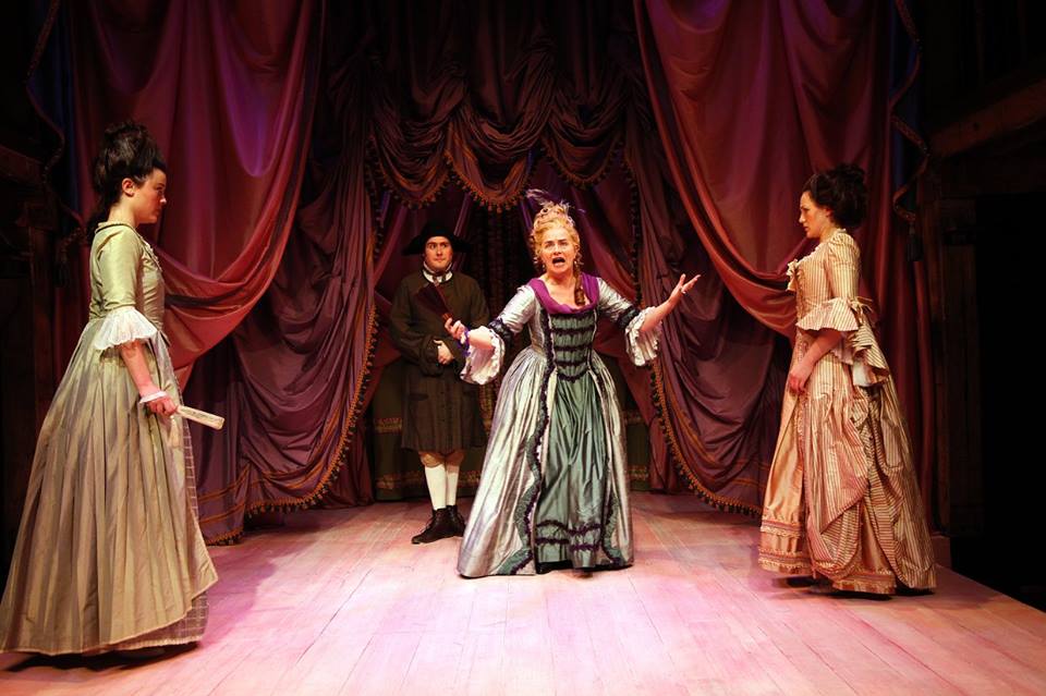 L to R: Lydia Languish (Emma Denly), Servant (James Mack), Mrs Malaprop (Julia St John), Julia (Charlotte Bate)