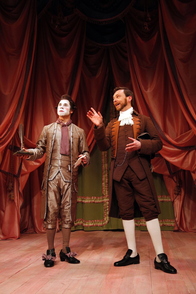 Bob Acres (Daniel Ableson) is dressed for Bath society. Sir Lucius O’Trigger (Christopher Logan)