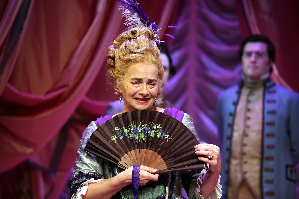 The most famous role is played by Julia St. John, Mrs Malaprop. I’d have loved an expensive prop like a sedan chair for her entrances, but that’s a National Theatre expenditure level, and this production gets on very well without it. I noted that Sheridan was just right in the number of malapropisms … they don’t come every other line for example. The adaptation has switched some … I’m sure Sheridan didn’t do calamari as a mistaken word for ‘calamity’, and no, I’m not going to check. I always think it’s good to update a few things.