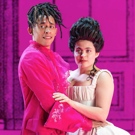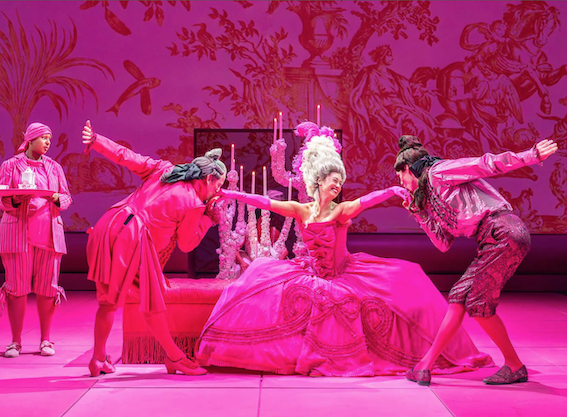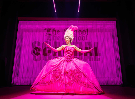 Think pink. Set and costume pink. shocking pink. It is highly stylised, the text has multiple updates too. Those are both positives, no actors In a play with characters called Sneerwell, Candour, Backbite, Snake and Surface should attempt naturalism. The costumes are hyper-real, no less than in Lady Sneerwell’s extravagant bustles which require her to enter and exit sideways. Entrances and exits are often via three rising platforms set into the stage. The location is projected on the back wall – Sir Peter’s House, Joseph Surface’s house (which has projected bookshelves). Music is modern, as is the dancing, yet the line up at the end mimics 18th century formal dance too. Gestures are extreme. They’re a major aspect of the fun, especially from Stefan Adgebola as Joseph Surface.