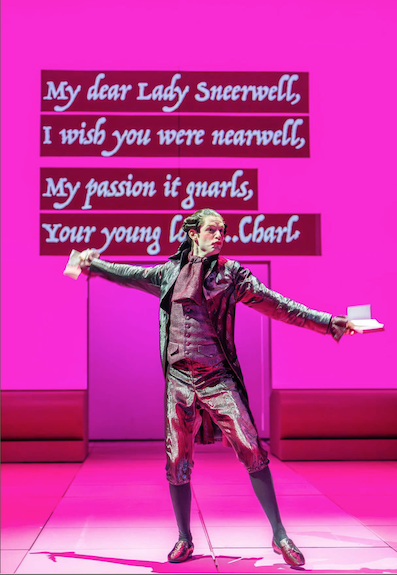 The RSC are not being subtle on the TV series Bridgerton connection. Snake writes fake notes from Charles Surface to Lady Sneerwell which are then writ large and projected. The anonymous scandal mongering in Bridgerton connects directly to Sheridan’s play.