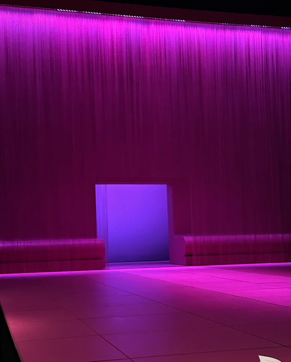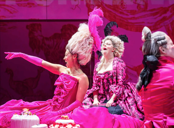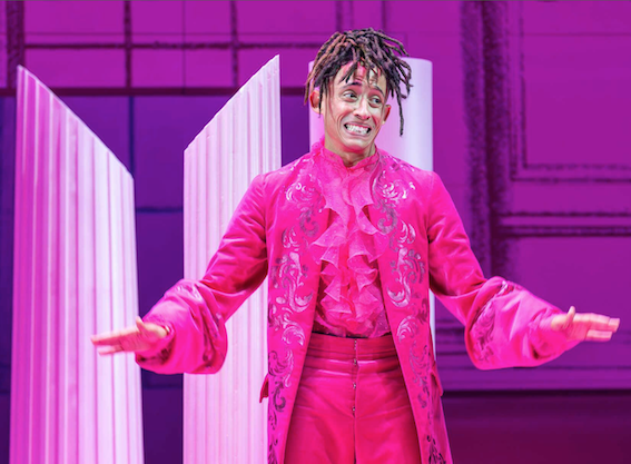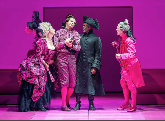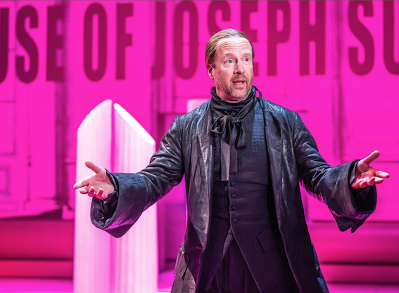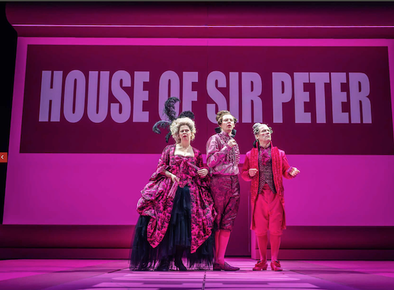 Think pink. Set and costume pink. shocking pink. It is highly stylised, the text has multiple updates too. Those are both positives, no actors In a play with characters called Sneerwell, Candour, Backbite, Snake and Surface should attempt naturalism. The costumes are hyper-real, no less than in Lady Sneerwell’s extravagant bustles which require her to enter and exit sideways. Entrances and exits are often via three rising platforms set into the stage. The location is projected on the back wall – Sir Peter’s House, Joseph Surface’s house (which has projected bookshelves). Music is modern, as is the dancing, yet the line up at the end mimics 18th century formal dance too. Gestures are extreme. They’re a major aspect of the fun, especially from Stefan Adgebola as Joseph Surface.