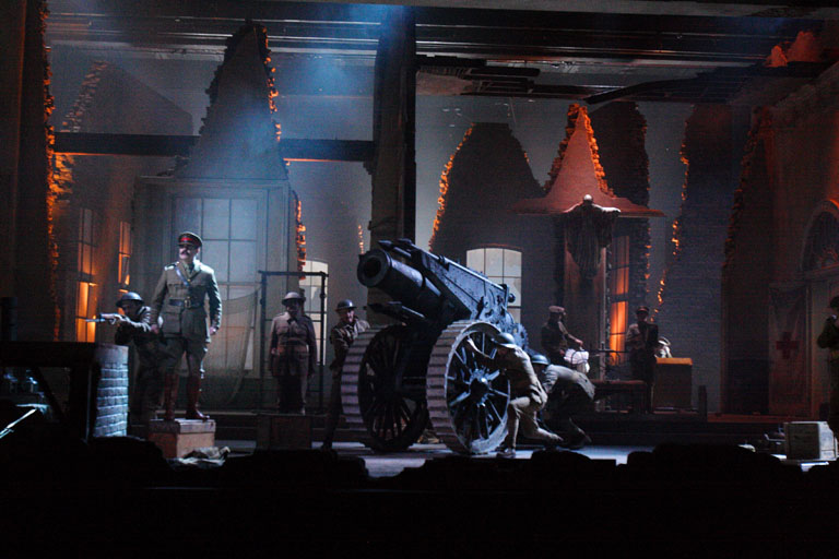 Then the set shifts to war in Act 2, with the most spectacular stage flashes and explosions I’ve ever seen, and we get massed troops, with Harry in the middle, but inexplicably no one else has Irish accents anymore. The set is fantastic, but stylistically we have operatic singing, then English officer silly buggers dancing about as in Oh, What A Lovely War, bits of folk song and lots of crashes and bangs. War is indeed incomprehensible and garbled, which was how I’d sum up Act Two, in spite of it being a tour de force of set design, and lighting and sound effects. All five star. Great direction of movement. Shame about the script. Shame about the play.The interval came here. My two word summing up was garbled, and in 1920s great artist as playwright style, pretentious.