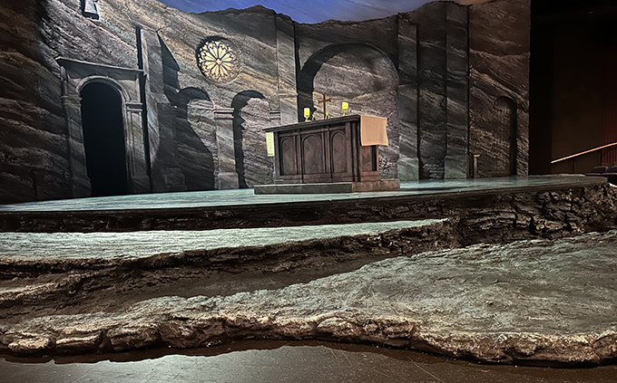 The ever-changing set design is so far ahead of what any theatre could have aspired to in the late 50s / early 60s. Chichester is perfecting the art of spreading their semi-circular thrust stage onto the auditorium floor. I had never seen a stairway leading off below stage right at the edge of the stage (between the rocks at 3 o’clock on the picture) . Was it built for this? It was used to effect. The abbey walls melt into a jagged mountain top.