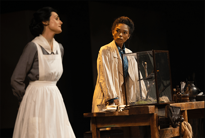 The set? They make great use of Chichester’s central stage lift to put desks and tables into place. At various times there were taxidermy cases on show. They were rectangular and blurry. I worked in a museum with taxidermy in display cases, and they were usually beautiful clear glass with rounded globes at the top. If you’re going to all the trouble of having taxidermy, I would have lit the cases from within. I think they did light Harry’s painting, and a skeleton. Oddly, the photos on line show well-lit cases. Did they forget to switch them on when we saw it? Or was it our angle?