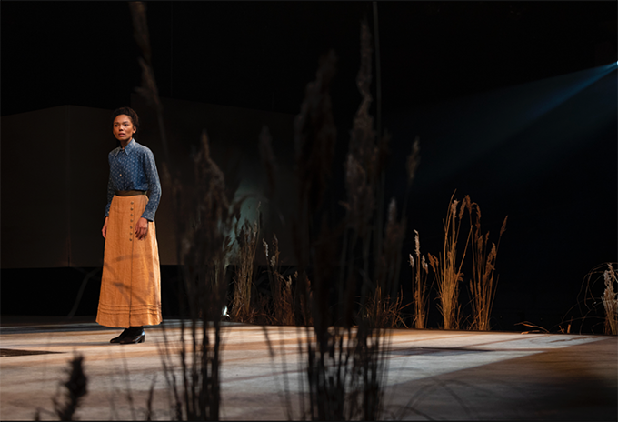 Chichester likes to line its semi-circular thrust stage with foliage at the edges. This time it was rushes to indicate the West Sussex marshes. Unfortunately, we were in Row B, and one stand of rushes was right in front of us, and Karen, shorter than me said she got REALLY irritated by trying to watch the action through the rushes. As she said, it’s not a story about Moses.