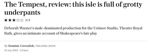 Four stars seems the consensus, but the three star reviews (and the un-star rated reviews) make similar points about the focus on the comedy trio, as well as a losing the Prospero / Miranda centre somewhat, and lack of clarity on Prospero.