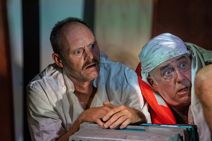 The shipwrecked courtly Milanese and Neapolitans are in evening dress, dinner jackets and life jackets with dripping wet faces, perhaps having swum in from a luxury yacht. Nicholas Chubb was Gonzalo, the one who loaded the exiled Prospero’s boat with supplies twelve years earlier. I think they lost some lines about that which undermines the role. He was last seen by us in Chichester just a few months ago in The Taxidermist’s Daughter and has an air of authority in every role.