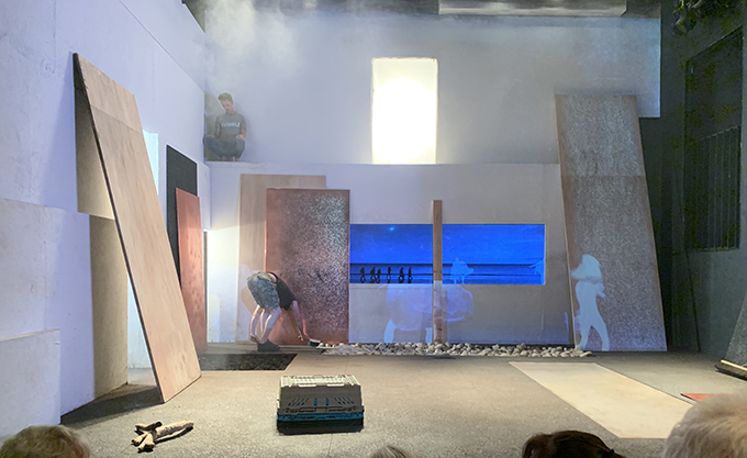 The set has panels of wood, some shiny, some plain fibreboard, propped around the sides. Some are propped over entrances and are flung down on specific entrances. There’s a top window like a balcony, and two large TV screens which have videos sometimes. There’s a pit of large pebbles for the barefoot cast to walk over, and a dirt pit. My heart usually sinks at dirt pits, ever since Calixto Bieto’s Forests at the Barbican, probably the worst play I have ever seen. They’re like overhead showers on stage, extremely uncomfortable for actors. In this Trinculo falls and wallows giving him dark brown underpants at the back for the rest of the play.