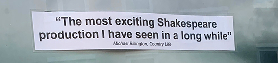 I thought Michael Billington had retired as our premier (and greatest) theatre critic, but the posters have an over-sticker from a Country Life review. We couldn’t find the review in the July or August issues (both were in W.H. Smith). But then I couldn’t find the Daily Mail review also stuck on the poster boards outside.