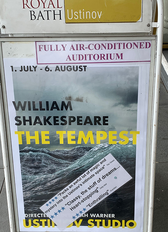 It has a cast of fourteen in a studio theatre that some sources say has 126 seats, others 140 seats. One review asked why they didn’t move it next door to the Theatre Royal. It’s running for a month. Without disparaging the Bath audience, the Theatre Royal was only half-full for August Wilson the next day. It fills for Ayckbourn, Rattigan and Coward. A visually elaborate Tempest with a couple of stars might work in the large theatre – Peter Hall did a Shakespeare in most of his seasons there – but this one wouldn’t fill it. It’s definitely a different, studio style version rather than a popular version. However, the result is a crowded stage when (e.g.) the shipwrecked seven are on together, let alone at the end.