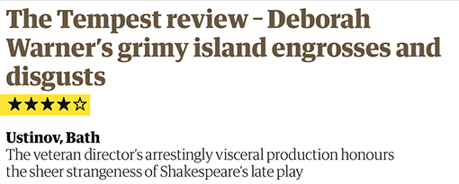 Four stars seems the consensus, but the three star reviews (and the un-star rated reviews) make similar points about the focus on the comedy trio, as well as a losing the Prospero / Miranda centre somewhat, and lack of clarity on Prospero.