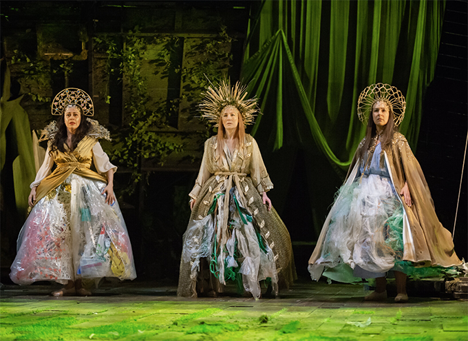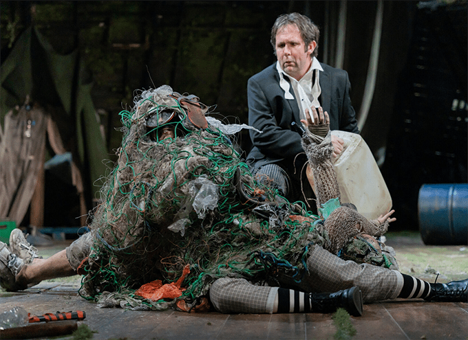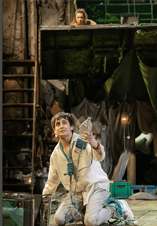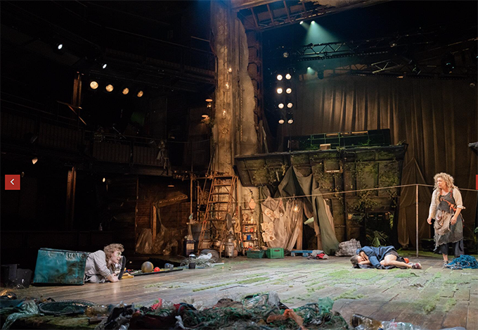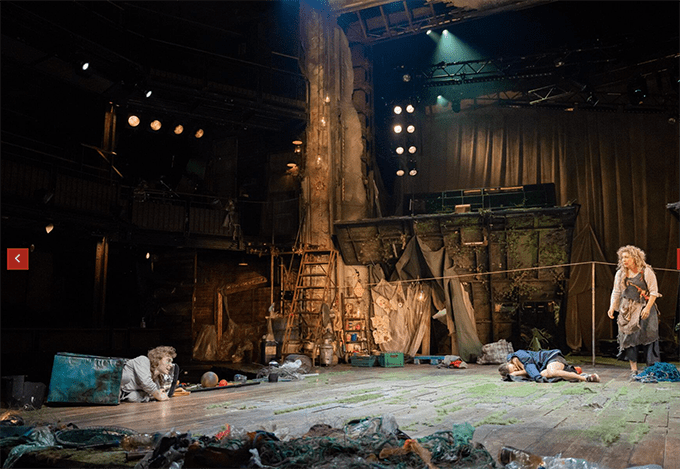 The setting is a future world suffering from a climate emergency. The poster (which is excellent) suggests it’s virtually Waterworld. The set was constructed out of used bits from the storerooms … that smacks a little of The Globe Ensemble’s awful “dressing up box, choose your own costumes” but it is not that haphazard and they have a fair stock of distressed sets. This looks like a ruined theatre with proscenium arch. While the programme boasts the green credentials of re-using stuff, it’s still very elaborate with levels going back, drawbridges, ladders, hoists, a large framed mirrored surface descending for just a couple of minutes, and an incredibly gratuitous use of mist from a rain machine in the last two minutes.