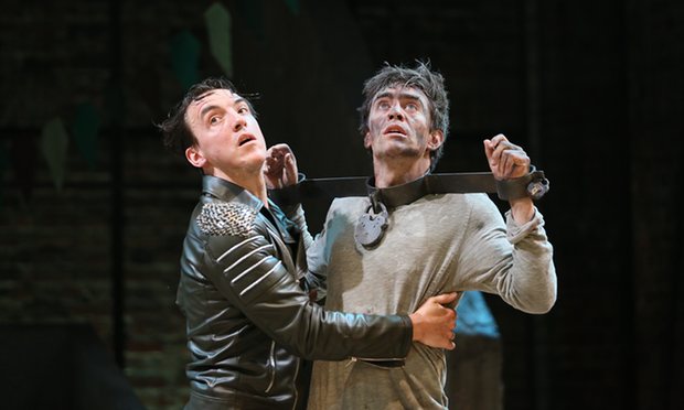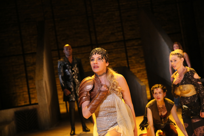 Her sister Emilia (Frances McNamee) gets an Amazon skintight helmet too (i.e. as worn by mythical Amazons rather than purchased from Amazon resellers with free one day delivery). The production is accent blind, and Quentin Letts in The Daily Mail grumbled that Hippolyta is Scots and Emilia is Yorkshire. They’re sisters, after all. Fortunately, both are so good and both accents are very light. The sexual ambiguity is reinforced when Emilia tells her sister how fond she was of Flavinia as a girl. It sounds more than a teenage pash too. Ironically, she is the object of desire for two men, Arcite and Palman, and though sympathetic to their struggles, doesn’t fancy either.