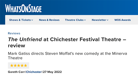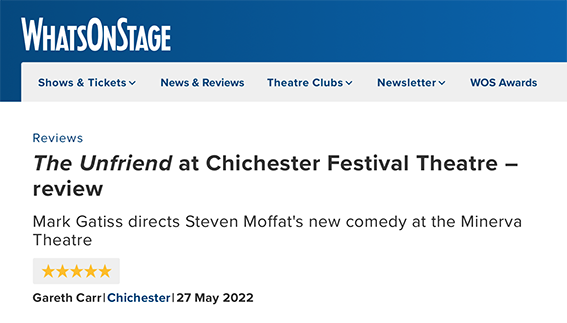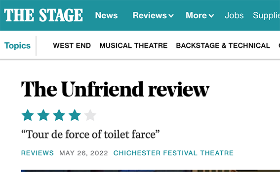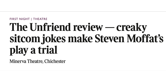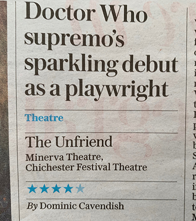 The play is written by Steven Moffat, and directed by Mark Gattis, so the Sherlock / Dr Who / Dracula TV team. Thursday was The Unfriend press night, and we saw the paid critics assembling by the chilled champagne as we left the restaurant, and as we came out of the Festival Theatre from Murder On The Orient Express at ten to ten, they were all assembled in the restaurant opposite. So full marks for getting reviews in the morning papers. However, they really differed.