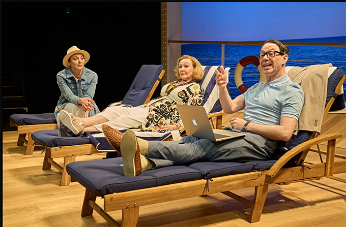 It’s not exactly like that. Elsa, the American they meet on the cruise, prevails on Peter and Debbie, the British couple to give them her e-mail address. In retrospect, maybe she tricks them into giving her the e-mail address. They don’t even make the insincere promise, however, when she asks if she can visit, they don’t know how to say no. So they Google her and discover that she’s suspected of multiple murders of relatives. They’re terrified of having her in the house. But this is not Facebook. They cannot simply “unfriend” her. Theatrically, projection is used to show what they’re looking at on a laptop … the use of projection is becoming a given in plays nowadays.