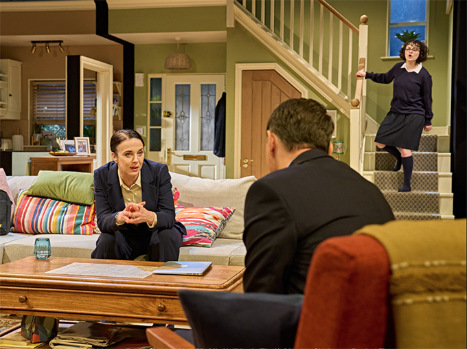 Promisingly, it has the same design and lighting team as Murder On The Orient Express – Rob Jones and Mark Henderson. It has the great Michael Simkins as the neighbour. The set is superb. You can see the outside of the modern estate house next to the top of the stairs, and lights go on and off in the upstairs rooms.
