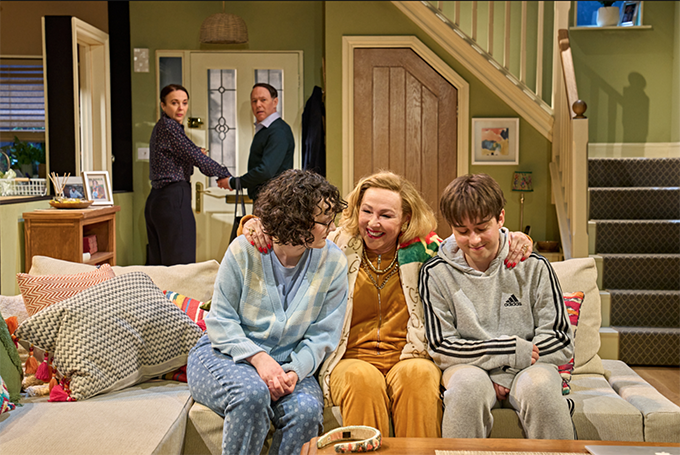 The household consists of teenage children (Gabriel Howell and Maddie Holiday, both so real). They have the world’s most boring man as the neighbour (Michael, Simkins). The play is rounded out by the local police officer (Marcus Onilude) first seen casually ransacking their fridge. The thing is that Elsa’s loud cheerfulness eventually seems to improve their kids’ lives and their lives. But yet … is she a serial killer? She’s offering to cook for them. She’s offering to babysit. The kids want her to stay. What will happen?