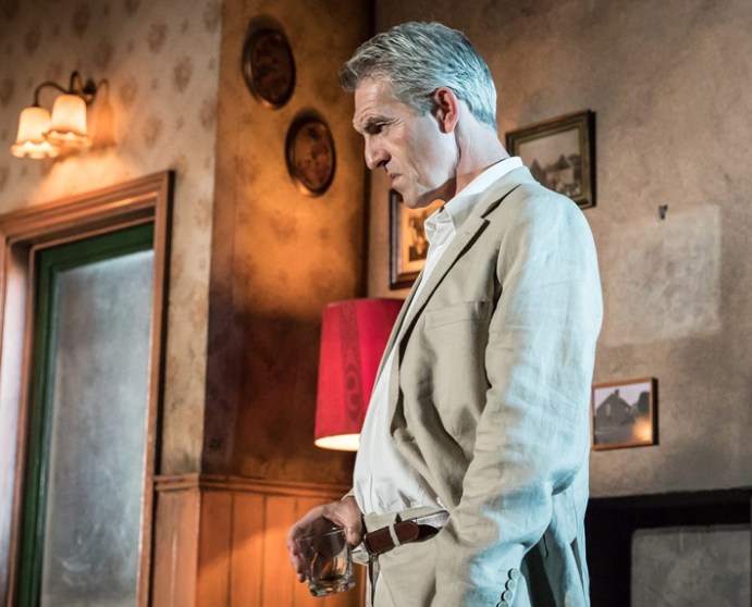It is a serious play, and an unusual one. This English Touring Theatre production has a meticulously detailed setting in a rural pub in Leitrim, in the North West of Eire. It’s the most sparsely populated county in Ireland, with just 31,000 people. We went to the pre-show talk, where they said it was Ireland’s loneliest county. They explained that they even used 1996 money on stage to keep total authenticity. The production also has a fascinatingly subtle lighting plot by Lee Curran, constantly shifting, but you never notice the shift until you realise that the person narrating has the light focus on them, and the listeners in the background are now in much lower light. There are frequent low level noise effects … wind, music sometimes.