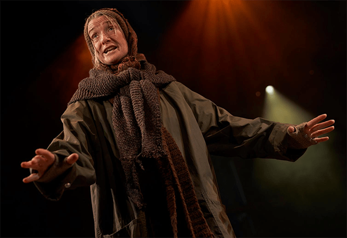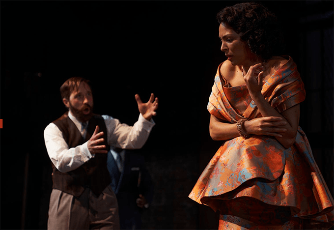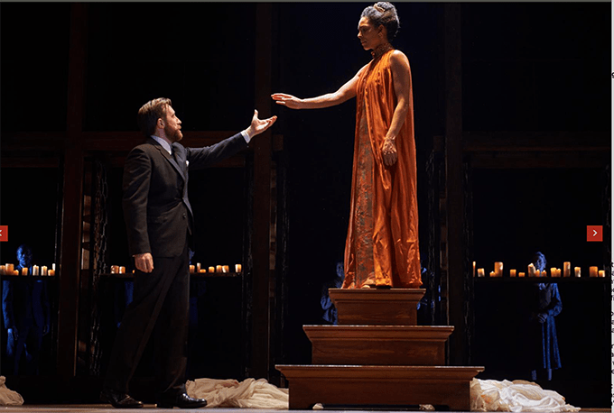 “Joseph Kloska plays King Leontes as a hysterical brute who is caught in the grip of high-pitched paranoia, his courtiers too mealy-mouthed to make a stand against his conspiracy theory that his “slippery” wife is having an affair with Polixenes (Andrew French). Only the fierce Paulina is brave enough to make a stand (“You’re liars, all”) and Amanda Hadingue’s impassioned performance is a highlight alongside Kemi-Bo Jacobs’s stoic, steely Hermione.“
