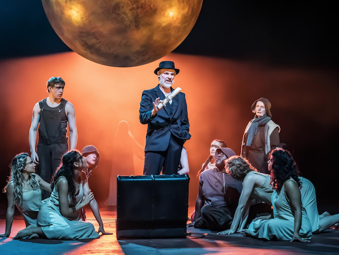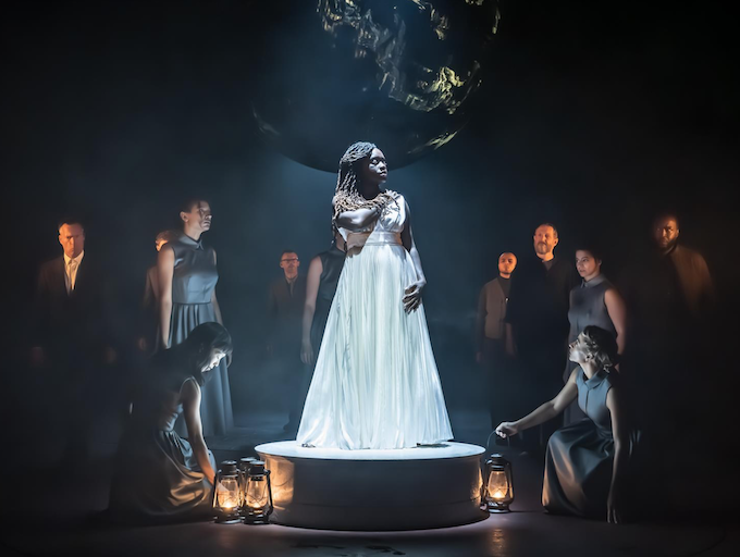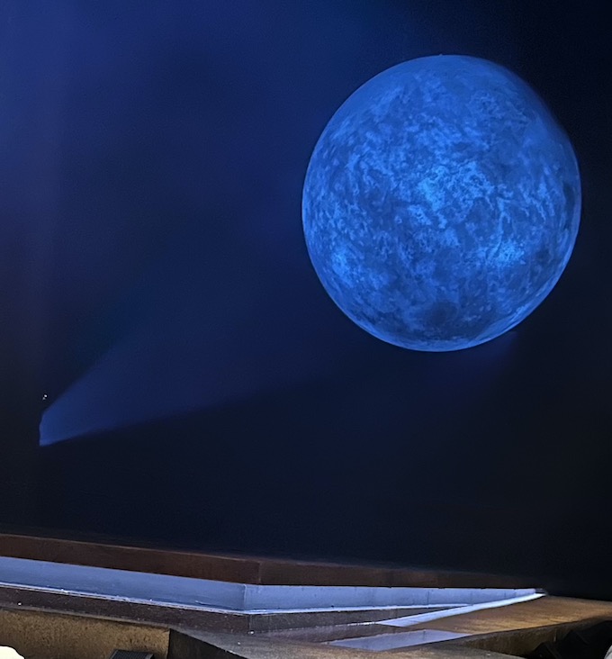For the first few minutes, my negativity was reinforced. A great big globe dominated the set which had water around the outside. The costumes were aggressively boring nondescript grey. People wafted about portentously. Time trudged dolefully around the paddling pool surround. Pretentious, μου? I thought. (Sorry, I have no idea whether it’s μου or με. It’s all Greek to me.) The globe will be blue or black for Sicilia, then red for Bohemia (Act IV), then black for the return to Sicilia (Act V), where costumes switch from grey to black too. Right at the end, the projection starts to revolve and reveals the Earth- Australia and New Zealand. There are two separate revolve stages, constantly turning in some scenes.