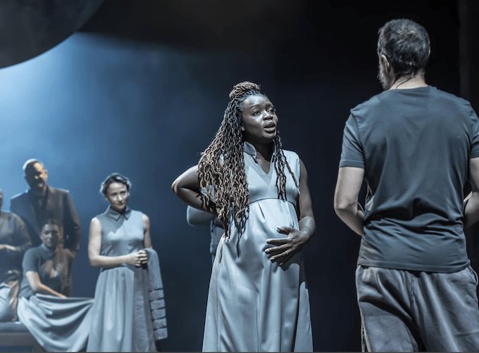 After the trial, we get the powerful scene where Leontes tosses the baby around, then Paulina tells Leontes what she thinks. Aicha Kossoko as Paulina is not someone you would dare mess with. She gives a towering performance in spite of Leontes’ threats. It’s at this point another thought comes. Many productions nowadays are colour blind. This isn’t. (Can I just use white and black for a change?) Leontes is white. Hermione is black,. Mamillius and Perdita, their children, are both mixed ethnicity. That leads to another point, remembering that the director, Yaël Farber, is South African. The “good” characters: Hermione, Paulina, Camillo are played by particularly strong black actors. Is this deliberate? It works. We both noted it.