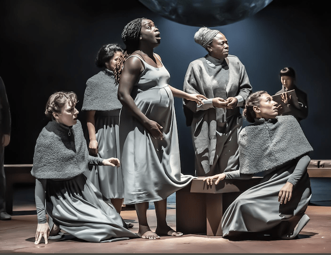 As you get to the trial of Hermione, you realise why you need a large ensemble as a chorus. They sit hands clasped, heads bowed watching (or trying not to watch), in uniform grey clothes, very much The Handmaid’s Tale.