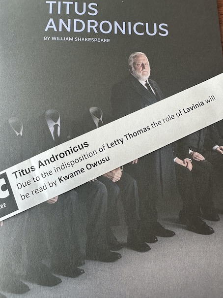 Lavinia is the most physically demanding part in the play, and also there is a great deal of physical interaction. But it was going to be READ, and by a MALE assistant director? I’d guess he’d worked on the scenes so knew the movements, but even so. How would there be the shock of the hands and tongue being cut off? Only two of the cast are listed as understudies, one for Aaron, one for Tamara. I guess if you lost Titus it would be a cancellation, but every theatre reserves the right to put on understudies. After all, you’ve travelled, you’ve booked a hotel. You’d prefer an understudy to an evening in the limited delights of Stratford. A look at the cast list reveals the only female possibility is Sharita Oomeer, playing the Nurse and a Goth, and she is understudying Tamara. Now this is normally why the RSC or National or Globe have two or three ensemble players who flesh out scenes, but also serve as understudies and indeed, understudies of other actors who are understudying lead roles. Clearly not here. It is an economy, but one too far. You can always have extra Goths and Romans, and I suggest they need one male and one female. No Lavinia is probably the second worst loss in the play.