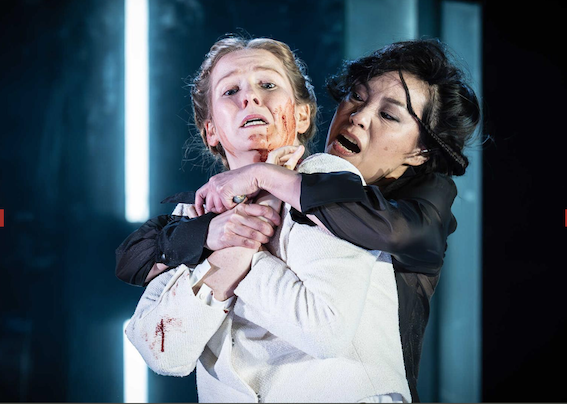 There are inevitably touches of gallows humour that bring grim laughter, such as Aaron brandishing and starting up a chain saw to cut off Titus’ hand, but nothing is played for laughs. The modern touch is that robotic machines trundle along overhead gantries to deliver nooses, chains, lift the slab in the centre of the stage. The robot arms can deliver way more blood than concealed blood capsules. They can drench the characters.