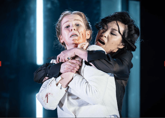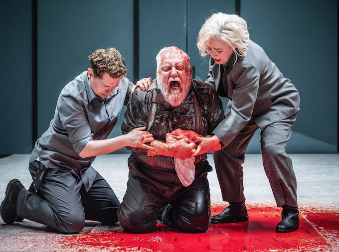 A dozen years ago, a new easily washable stage blood suddenly meant gallons of the stuff in productions. In Jamie Lloyd’s Macbeth at the Trafalgar Studio, the front two rows got heavily splattered. Like most new theatrical toys, after that initial overuse, stage blood got less used. This is Titus Andronicus, the bloodiest play of all. There will be blood. At some points hoses descend to apply it. Yes, that much blood.