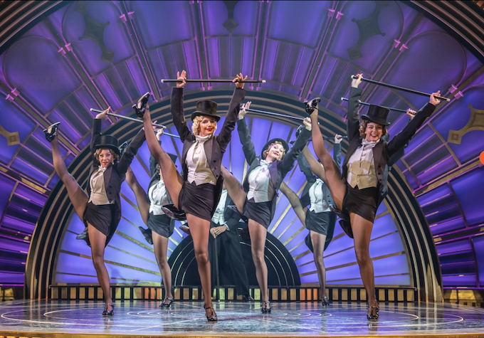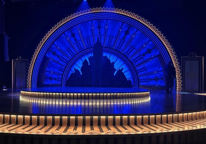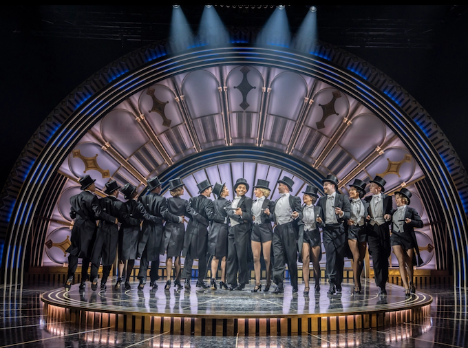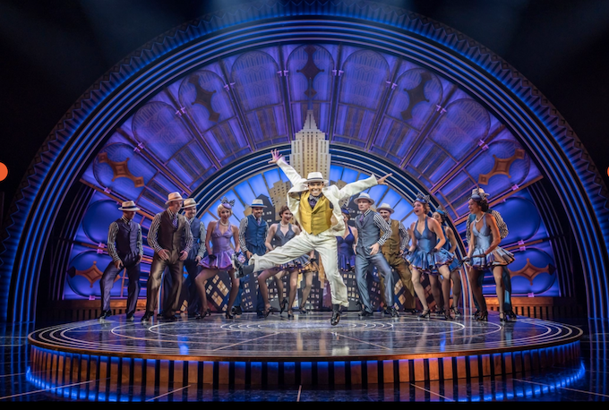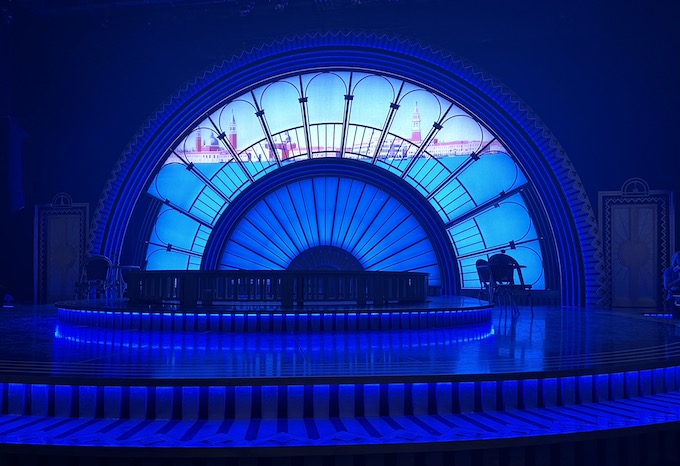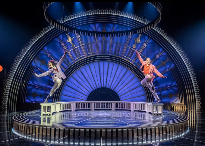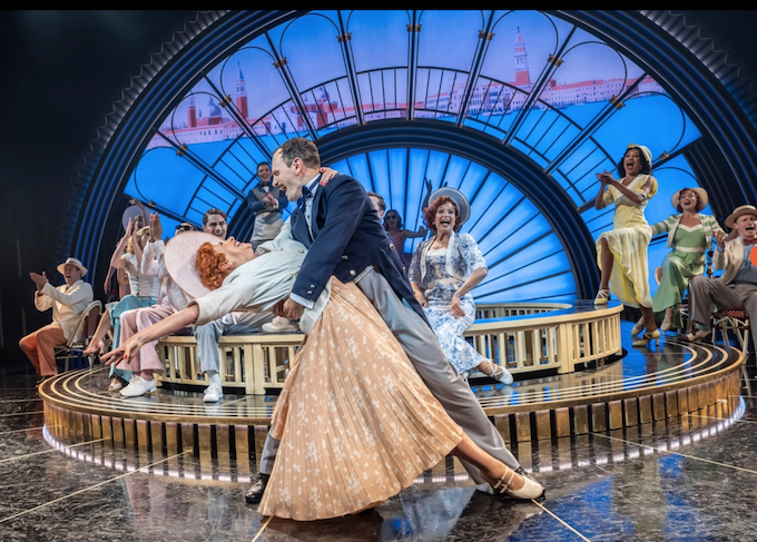 The art deco set looks glorious with an efficient rotating inner stage and two levels. During the overture there is a light show as the colours shift throughout. The first scene is New York, but then it shifts to London, and in Part Two, Venice. Projected skylines indicate the city.