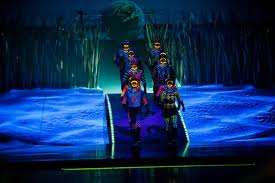 The Cirque du Soleil are an unmissable event, if like me, you are fascinated by the mechanics of lighting and stage production. They are the cutting edge, and every time seem to have honed that edge more. I’ve seen their big Las Vegas shows, Ka and O (“eau”) in the purpose built theatres, designed around the shows. O is simply the greatest theatrical experience I’ve ever had, and it was as good a year later, the second time around. Touring productions have fifty artists instead of 120 or more, and brilliant as the mechanical contrivances are, they can’t match the stage switching between a swimming pool and a stage in O, or the stage which could go to 45° and 90° in Ka.