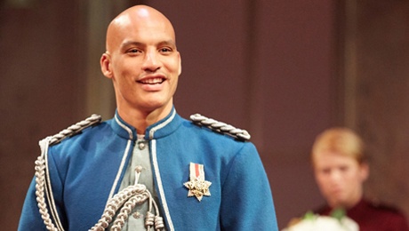 The costumes are excellent too, with maroon, light Prussian blue and red giving a definite palette. Certainly one excellent point is putting Viola and Sebastian in maroon military jackets. Because it’s a uniform from their country, and which only they wear, it gets over the awkward point about her deciding to dress in his style and getting it absolutely identical, not that we ever worry too much about the logic in these twin plays.