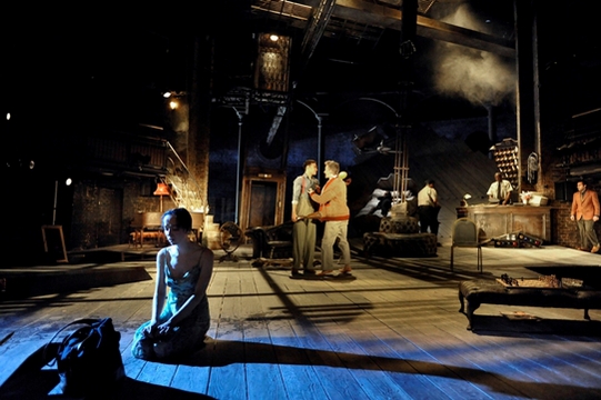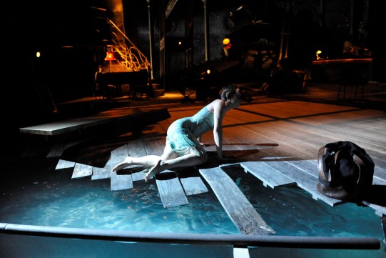 Incoherence tops the lists of faults, and by that I mean incoherent direction, not delivery. It starts with the set, which is lumped on top of the base shipwreck stage. The set is an exploded hotel. (The programme notes to The Tempest say it’s a hotel after a flood, but I wouldn’t have guessed). Reception desk here. Three story lift with metal gates there. A huge bed angled on the back. A bath here. A broken sink there. The Tower of Terror Hotel perhaps. The set is so messy that it has an effect on the play.