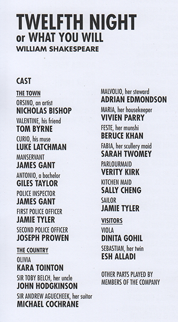 Th reference is Victorian interest in the Indian empire. As in virtually every production, they mark out Viola and Sebastian as twins and importantly as foreigners by using ethnicity: in this case, they’re both Indian. Feste, Olivia’s fool, is also Indian, as the programme notes, in a fashionable touch of