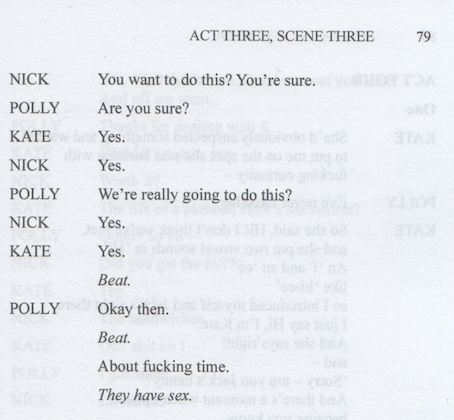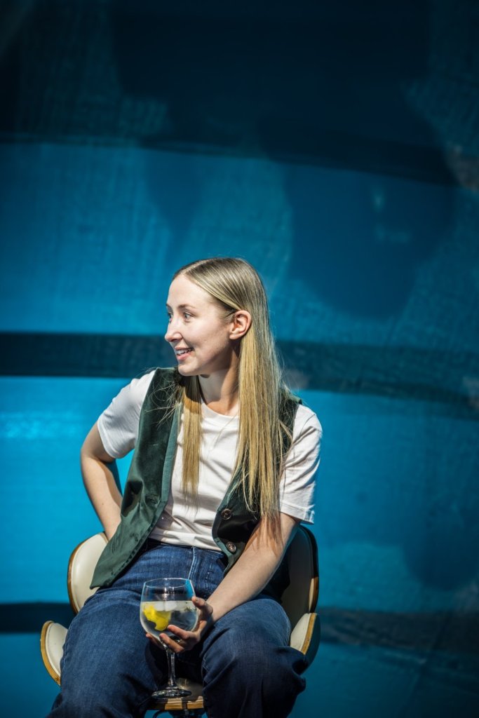The mature student who is the third person is Kate (Erin Doherty). She is 28 at the start, 30 at the end. Polly is her teacher and we start with them having a drink on bar stools. Kate rates Polly’s poetry too. Polly realises she fancies Kate. Polly makes the moves to recruit her, Nick is diffident and reluctant. The play consists of talking about their potential then actual three way relationship. Though there is much explicit dialogue on sex, lubricants, positions, preferences and bodily fluids, there is absolutely no sex beyond kissing on stage. No one disrobes.