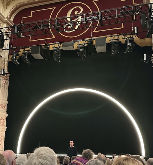 The programme points out it’s a rare new play in commercial (aka overpriced) West End Theatre and repeats three times that SUBSIDISED theatre normally breaks new plays. So ‘subsidised’ is a loaded word, a perjorative in the context. So SUBSIDISED means a cast of twenty four plus six musicians at the RSC, National Theatre or Globe (and I believe the Globe is self-financing) rather than three TV stars at a swingeing £150 for tickets (we paid £95 for the middle area)? They’re cashing in on the TV relationship.
