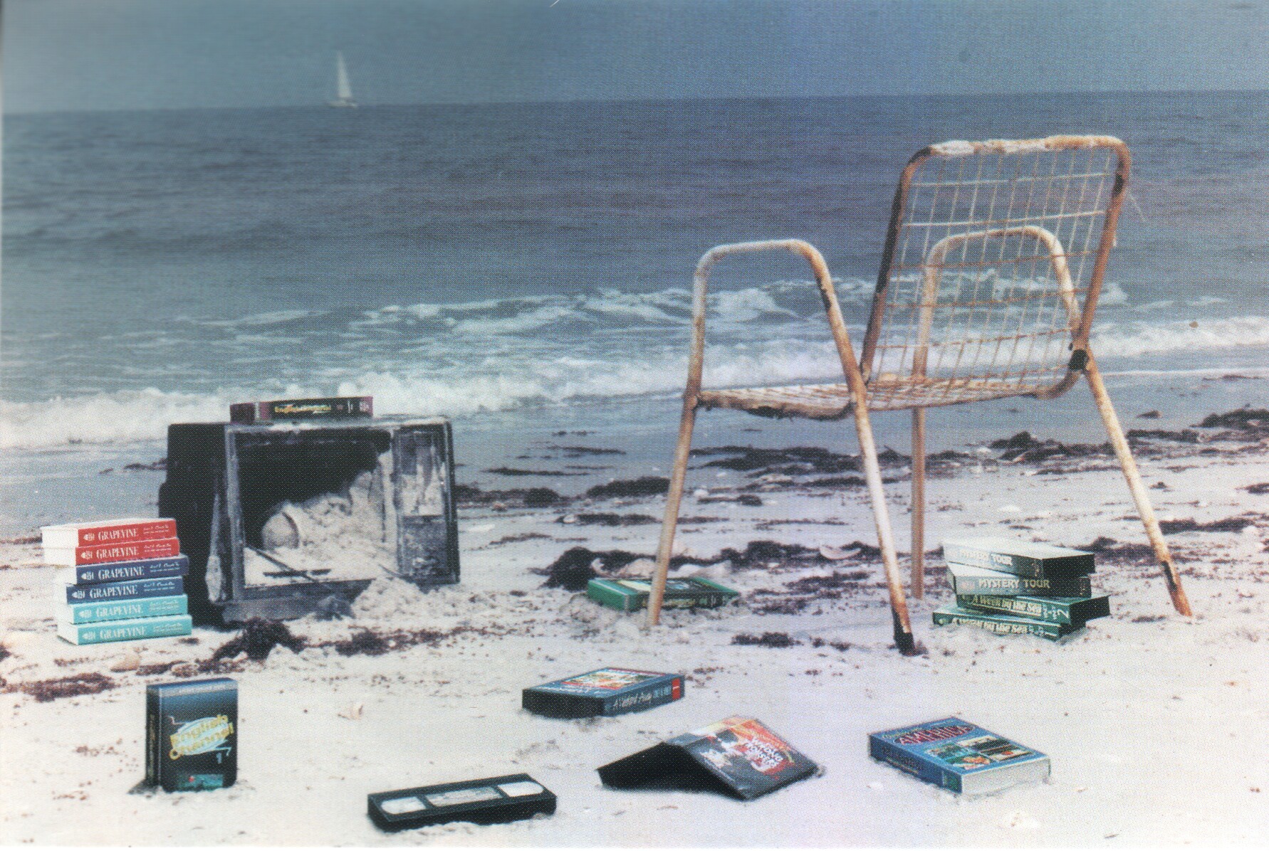 We used this postcard as our “business card” for years. The basic photo was taken by me with a disposable camera on a sand island near St. Petersburg, Florida. The video boxes were inserted with Photoshop by Daniel Viney. We never realized how true the picture would become!